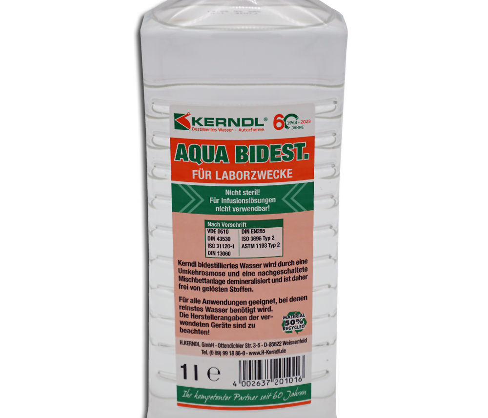 Kerndl Bidestilliertes Wasser wurde durch Umkehrosmose und eine nachgeschaltete Mischbettanlage demineralisiert, wodurch es frei von gelösten Stoffen ist. Dieses hochreine Wasser eignet sich perfekt für Anwendungen, bei denen reinstes Wasser benötigt wird, und ist besonders für die Schallplattenpflege geeignet. Es ist ideal zum Verdünnen von Reinigungs-Konzentraten, wie z. B. unserem l‘Art du Son Konzentrat, und sorgt so für eine optimale Pflege und Reinigung Ihrer LPs.